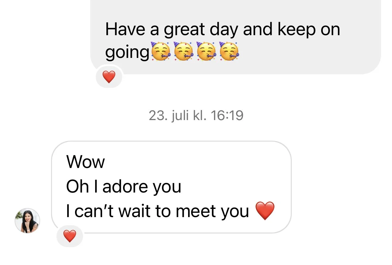 I sommer vurderte jeg hardt å dra til USA på et event hun arrangerte. Jeg meldte masse med henne på innboksen på Instagram, men valgte i siste sekund å trekke meg. Det kostet mye penger og jeg tenkte jeg skulle spare penger til neste event.